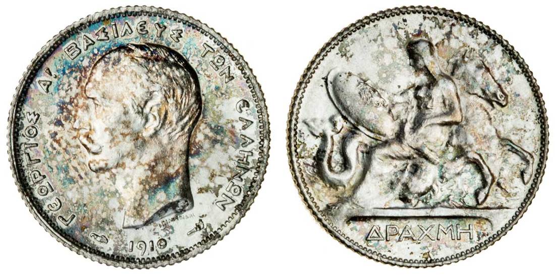 (x) George I (1863-1913), Drachma, 1910 A, Paris, bare head left, date and mint marks torch and cornucopia below, rev. Thetis on a seahorse, value below (Divo 54a; KM 60), uncirculated