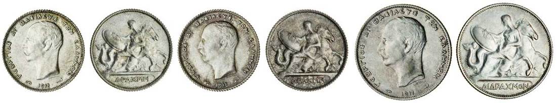 (x) George I (1863-1913), 2-Drachmai, and Drachmas (2), all 1911 A, Paris, bare head left, date and mint marks torch and cornucopia below, rev. Thetis on a seahorse, value below (Divo 52, 54b; KM 61, 60), good very fine, very fine, and extremely fine (3)