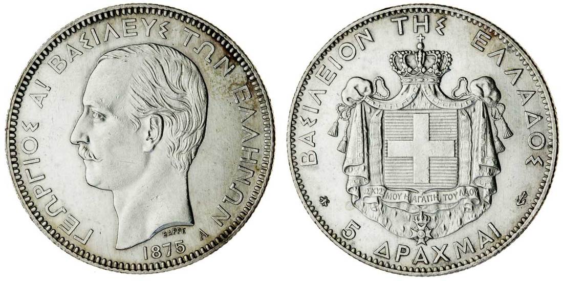 (x) George I (1863-1913), 5-Drachmai, 1875 A, Paris, bare head left, date and mint letter below, rev. crowned shield, value and mint marks bee and anchor below (Divo 50a; KM 46), cleaned, good very fine