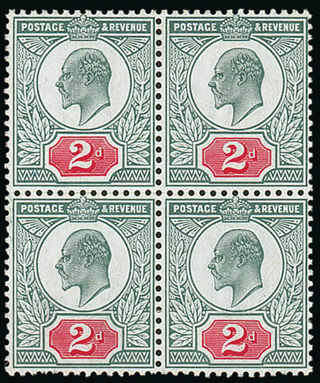 — 2d. dull blue-green and carmine, block of four, original gum with the upper pair remaining unmounted mint; a few minor perf. irregularities. Scarce. Specialised M12 (2), £540. Photo