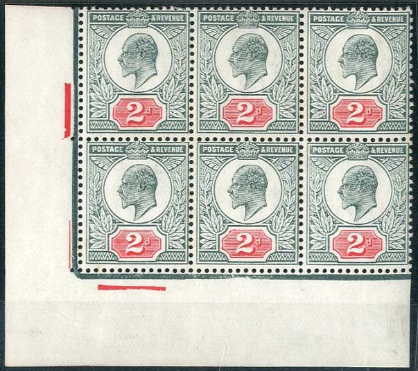 — 2d. grey-green and scarlet, block of six (3x2) from the lower left corner of the sheet, original gum with all but two remaining unmounted mint; fine. Specialised M12 (4), £410+