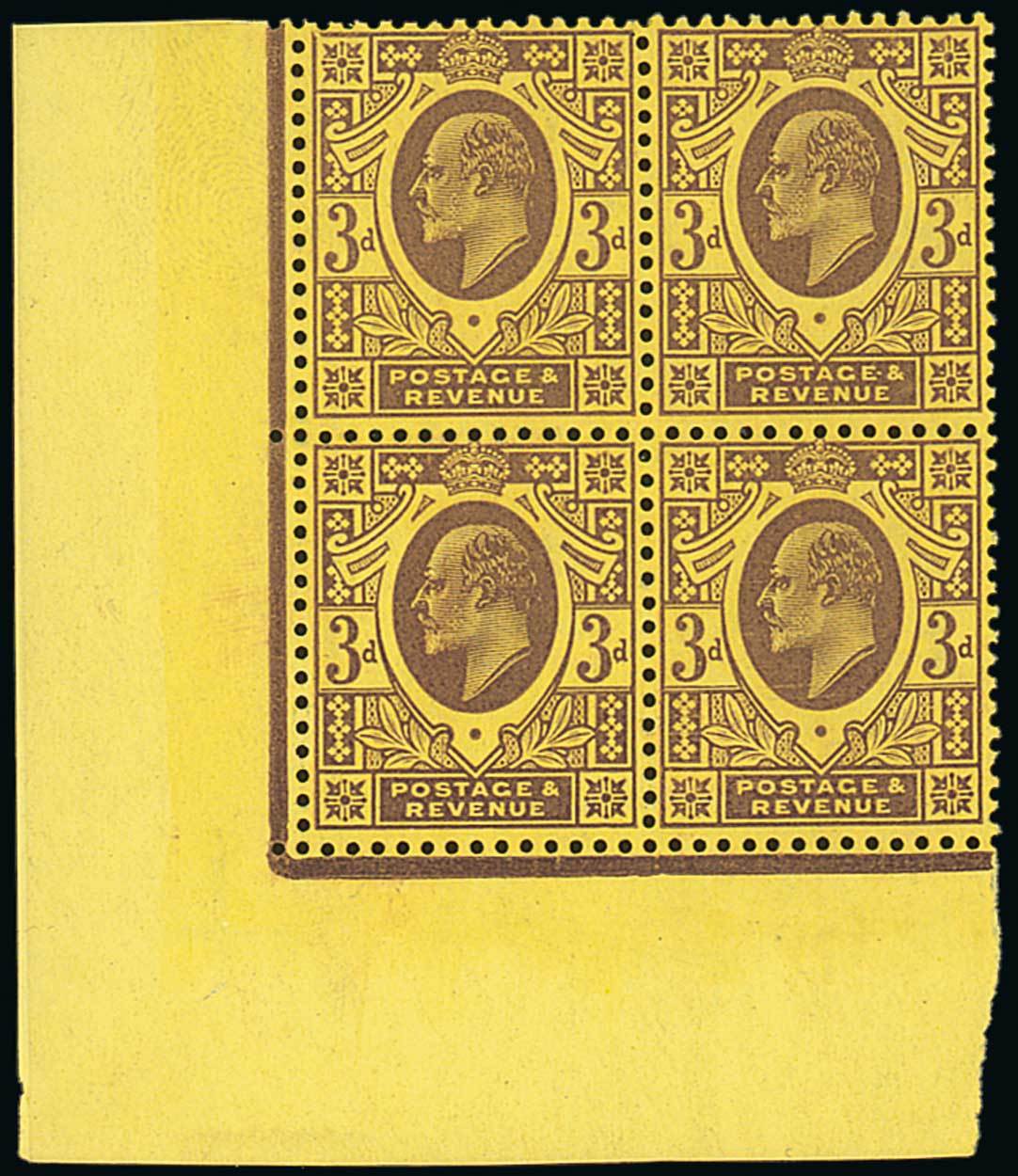 — 3d. dull purple on orange-yellow, block of four from the lower left corner of the sheet, unmounted mint; fine. Specialised M20 (2), £1,700+. Photo