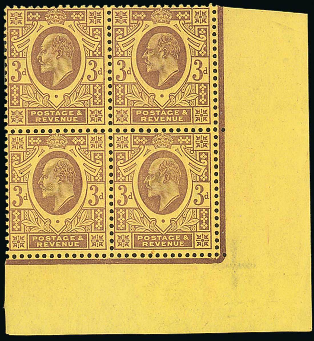 — 3d. dull reddish purple on lemon back, yellow front, block of four, original gum (slightly disturbed), fine appearance and scarce. Specialised M20 (3). Photo