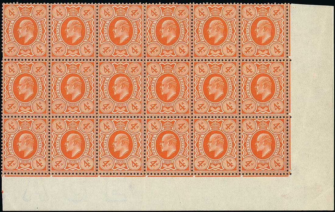 4d. brown-orange, block of eighteen (6x3) from the lower right corner of the sheet, original gum with all but three remaining unmounted mint; some gum wrinkles (mostly in the margin); fine and a rare positional piece. Specialised M25 (1), £5,790. Photo