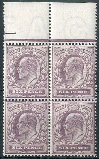 Ordinary paper 6d. pale dull purple, block of four from the top of the sheet, unmounted mint; fine. Specialised M31 (1), £425