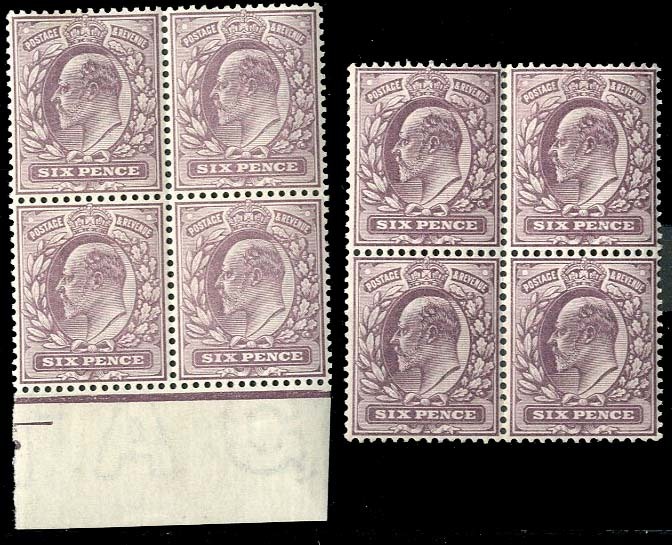 — 6d. pale dull purple, block of four from the foot of the sheet, 6d. slate-purple, block of four, unmounted mint; fine. Specialised M31 (1-2), £859