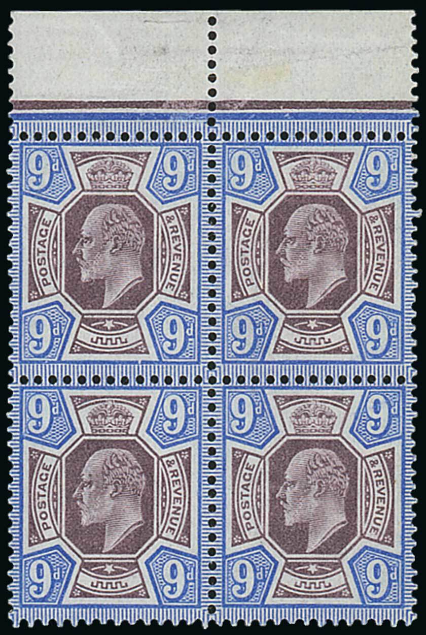 — 9d. slate-purple and ultramarine, block of four from the top of the sheet, unmounted mint; fine. Specialised M39 (2), £1,250. Photo