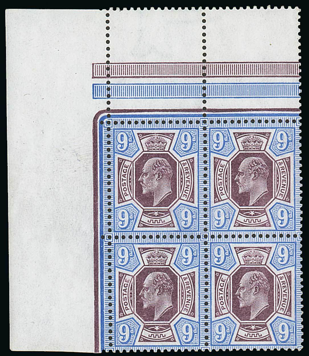 — 9d. slate-purple and ultramarine, block of four from the upper left corner of the pane, unmounted mint; fine and fresh. M40 (2), £1,100+. Photo