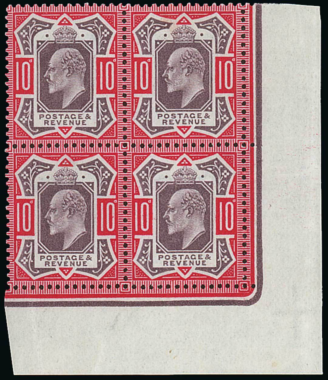 Ordinary paper 10d. dull purple and carmine, block of four from the lower right corner of the sheet, unmounted mint; hinged in the margin, fine and fresh. Specialised M42 (1), £1,375+. Photo