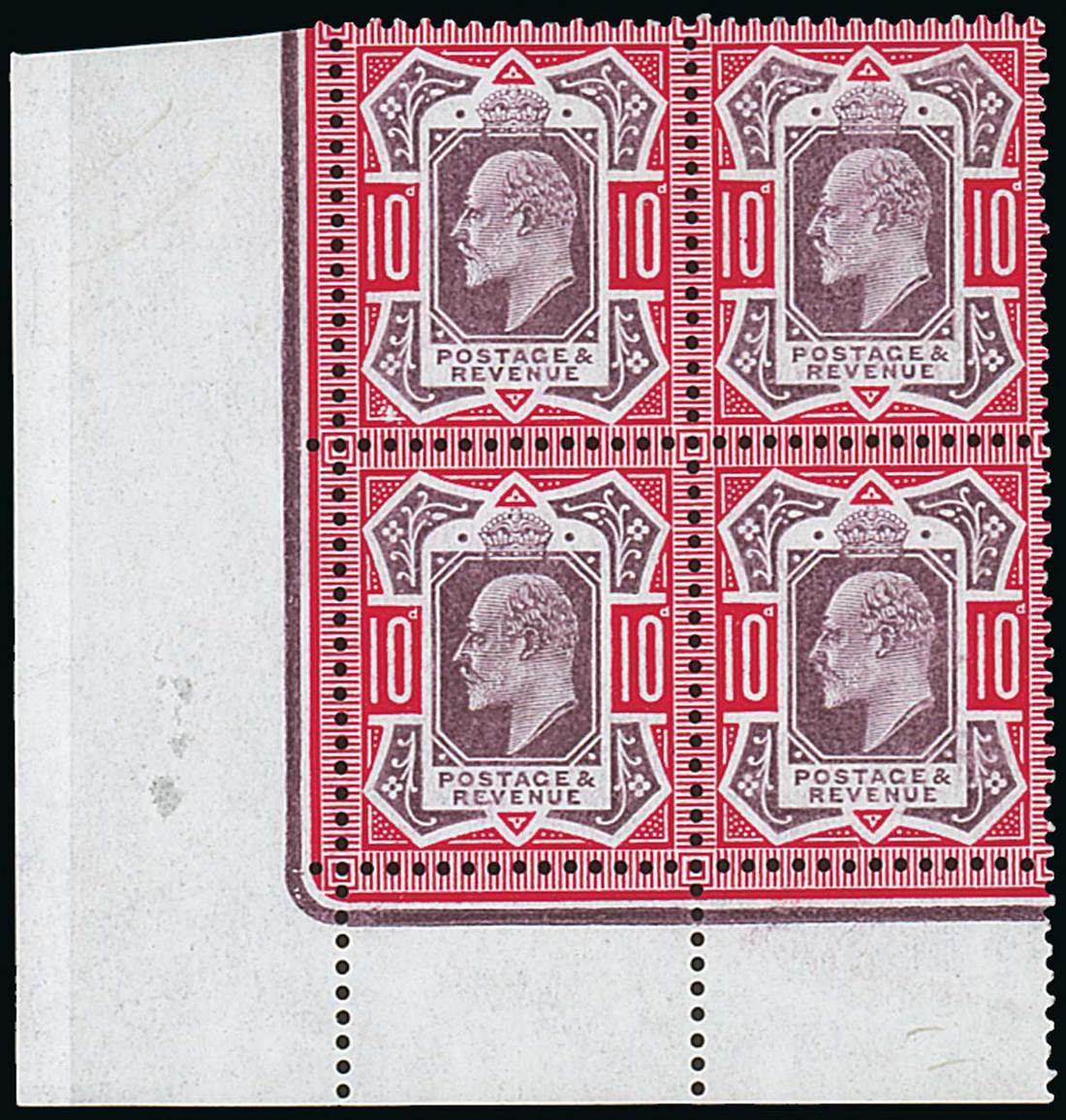 — 10d. slate-purple and carmine, block of four from the lower left corner of the sheet, unmounted mint; a trifle rubbed, fine and fresh. Specialised M43 (2), £1,300. Photo