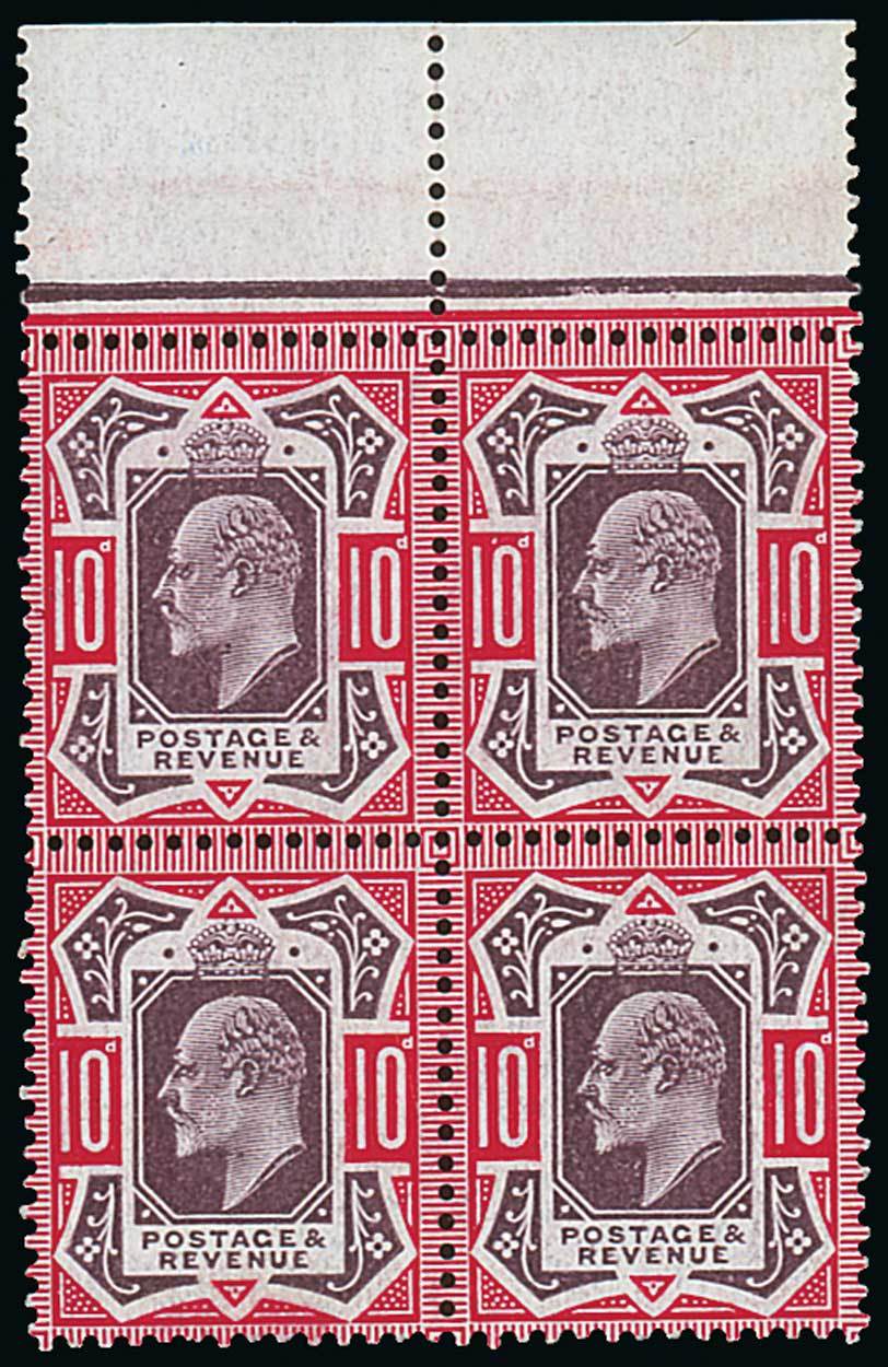 — 10d. slate-purple and deep carmine, block of four from the top of the sheet, unmounted mint, tiny wrinkles, fine and fresh. Specialised M43 (3), £2,000+. Photo