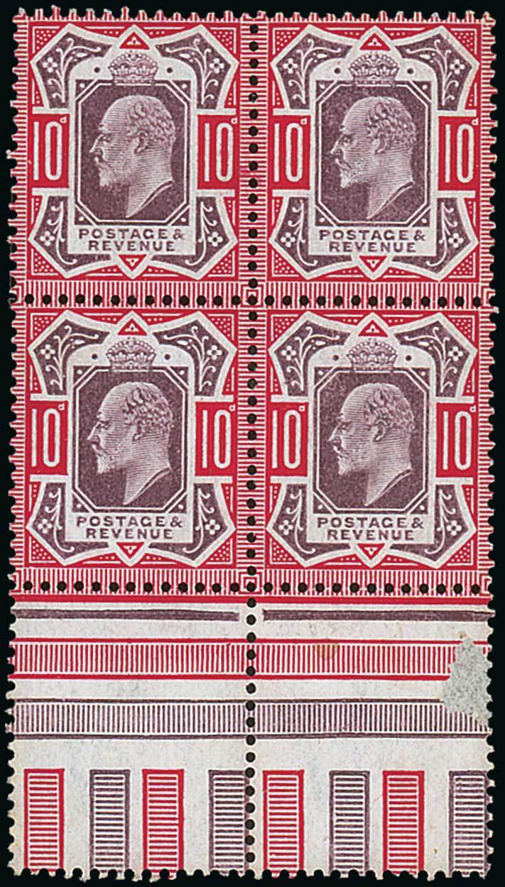 — 10d. slate-purple and deep carmine, block of four from the foot of the pane, unmounted mint; surface scrape in the interpanneau margin, fine. Specialised M43 (3), £2,000+. Photo