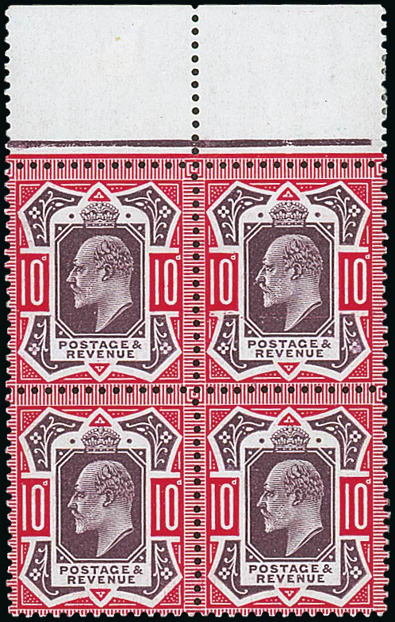 — 10d. slate-purple and deep (glossy) carmine, block of four from the top of the sheet, unmounted mint; hinged in the margin, fine. An exceptionally rare block of this rare shade. Probably the finest of the very few existing blocks. Specialised M43 (4), £26,000+. Photo