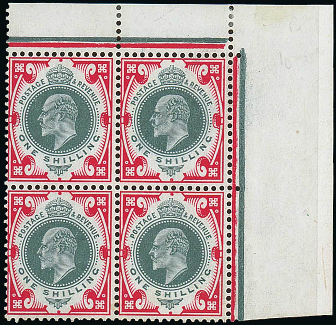 — 1/- deep dull green and scarlet, block of four from the upper right corner of the sheet, original gum with the lower pair remaining unmounted mint; fresh colours and fine. Specialised M46 (4), £750+. Photo