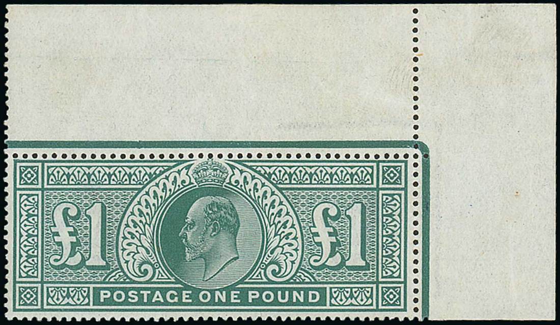 £1 dull blue-green, from the upper right corner of the sheet, unmounted mint; some minor wrinkles (mostly in the margin), fresh colour and fine. Specialised M55 (1), £3,500. Photo