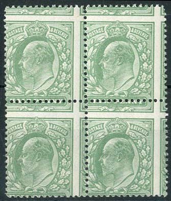 ½d. dull yellow-green, block of four with significant perforation shift, unmounted mint; tiny wrinkles, fine. Specialised M3 (1)