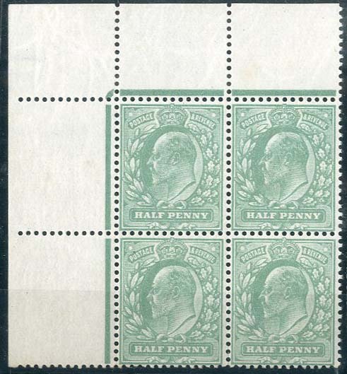 ½d. pale bluish green, block of four from the upper left corner of the sheet, unmounted mint; some wrinkles or gum creases, fine. Specialised M3 (5)