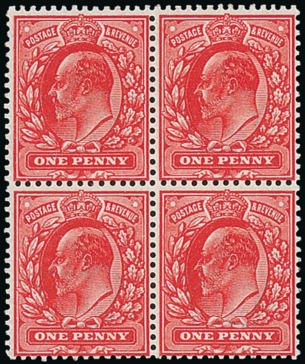1d. intense rose-red, block of four, unmounted mint; some minor wrinkles, fine and scarce. Specialised M6 (3), £1,500+. Photo