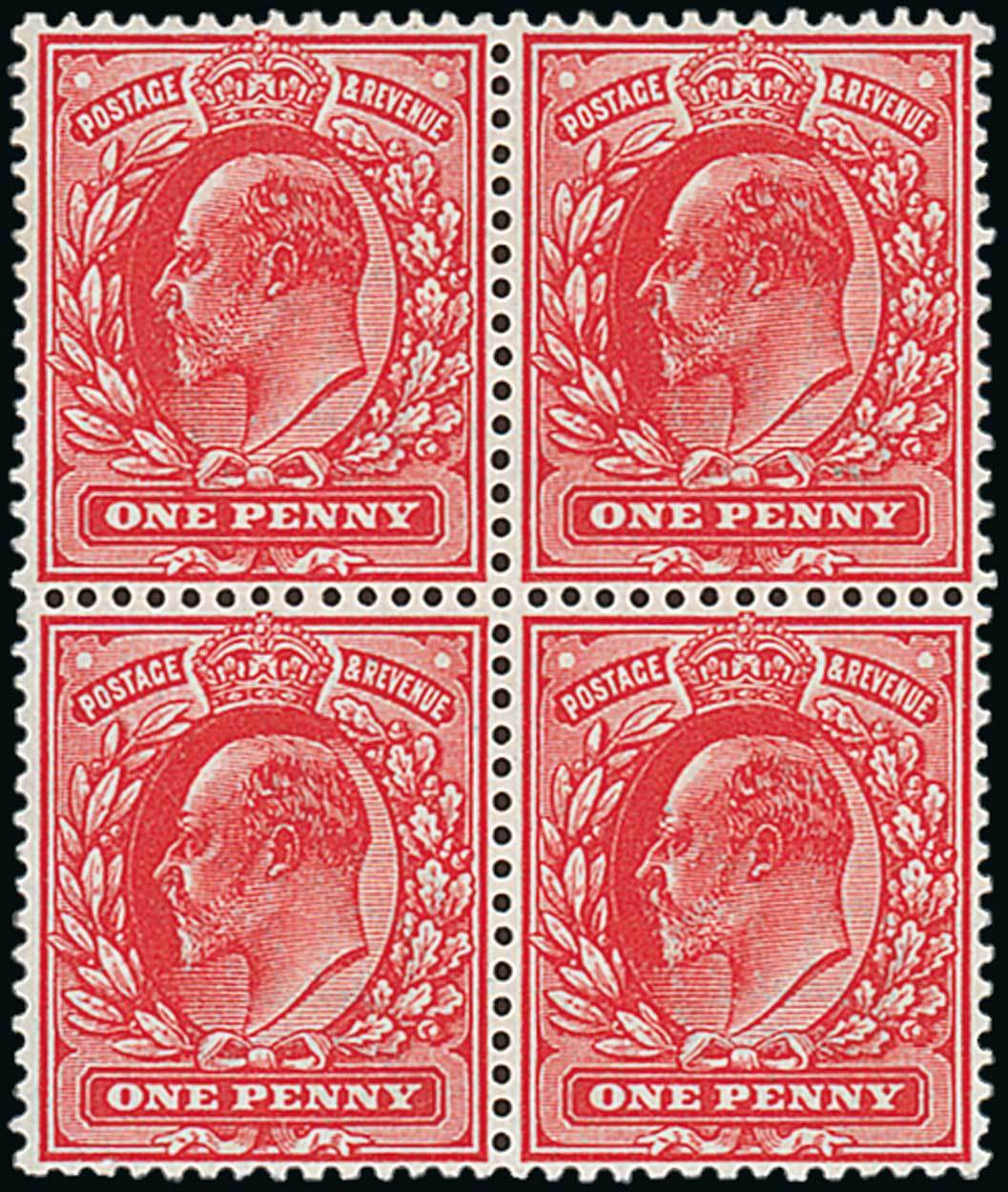 1d. deep rose-carmine, block of four, unmounted mint; a few minor wrinkles, fine and scarce. Specialised M6 (6), £2,400+. Photo
