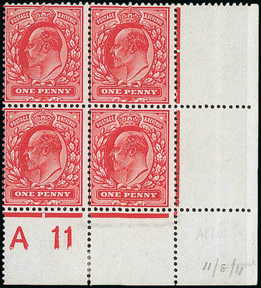 1d. deep rose-carmine, Control "A11" block of four from the lower right corner of the sheet, unmounted mint; centred to left, hinged and with vertical crease in the margin, fine. Specialised M6 (6), £2,400+. Photo