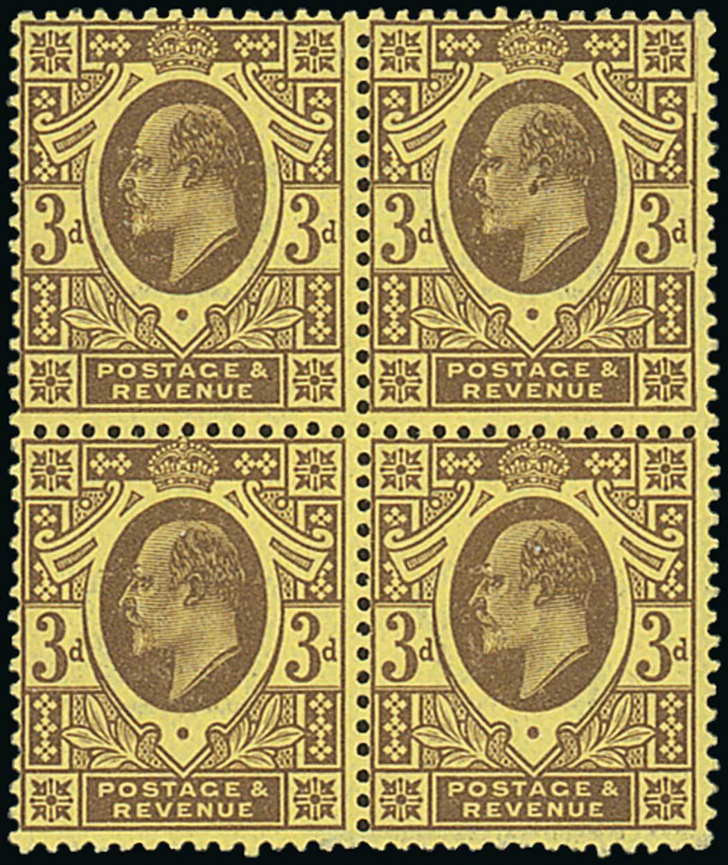 3d. purple on lemon, block of four, unmounted mint; slight wrinkles, fine and fresh. Specialised M21 (1), £1,100. Photo