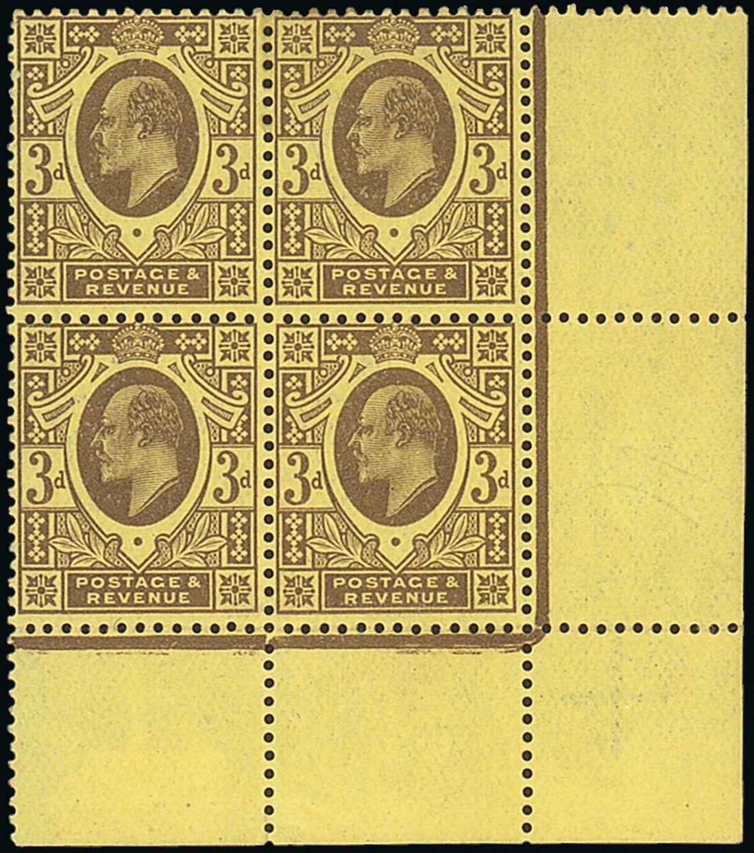 3d. purple on lemon, block of four from the lower right corner of the sheet, original gum with two remaining unmounted mint; a few small wrinkles, fine and a scarce positional piece. Specialised M21 (1). Photo