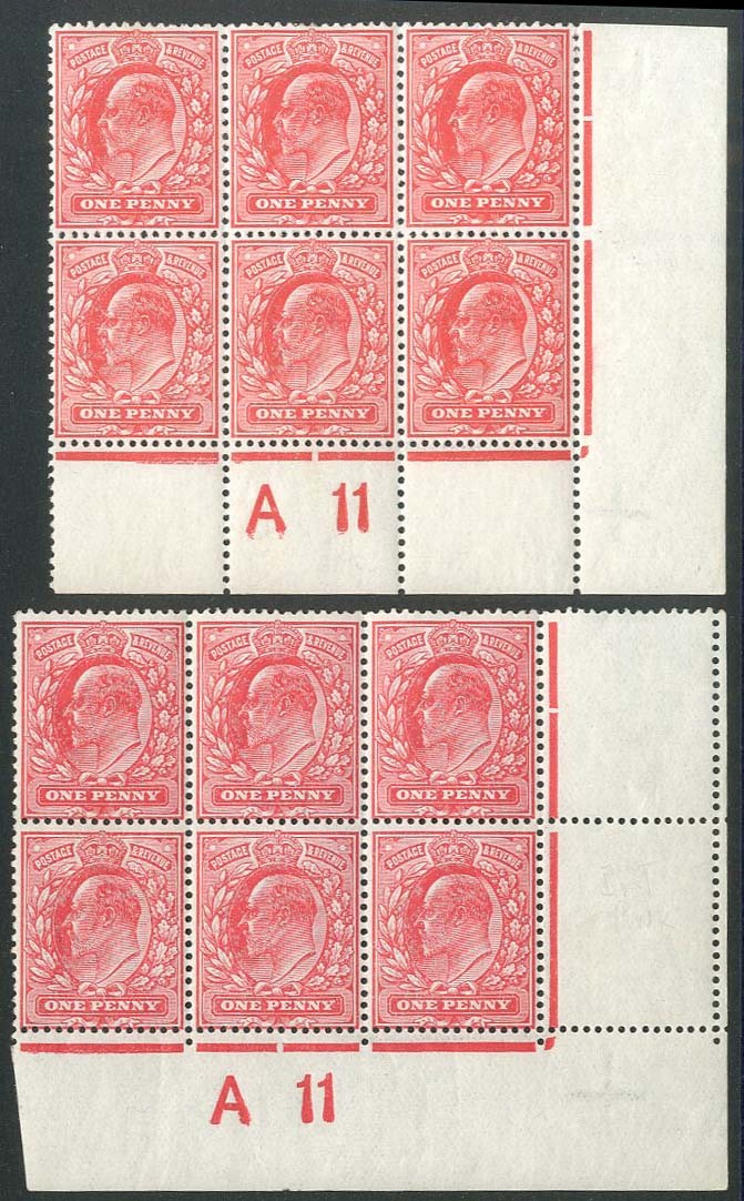 1d. pale rose carmine and 1d. rose-carmine, each in a Control "A11" block of six (3x2) from the lower right corner of the sheet, unmounted mint or original gum; fine. Specialised M7 (4-5)
