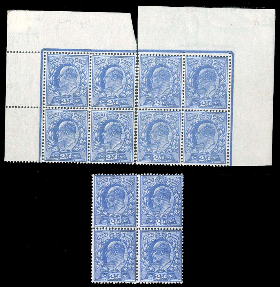 2½d. deep bright blue block of four, 2½d. bright blue and 2½d. dull blue corner blocks of four, unmounted mint or original gum; fine. Specialised M18 (1-3)