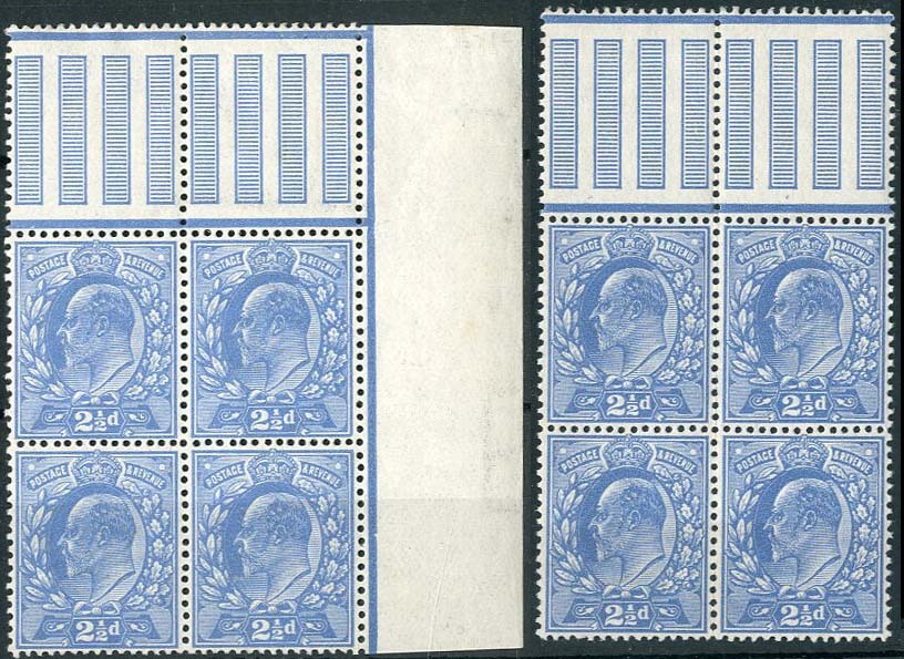 2½d. dull blue, two blocks of four with interpanneau margins at top, unmounted mint, hinged in the margins, fine. Specialised M18 (3)