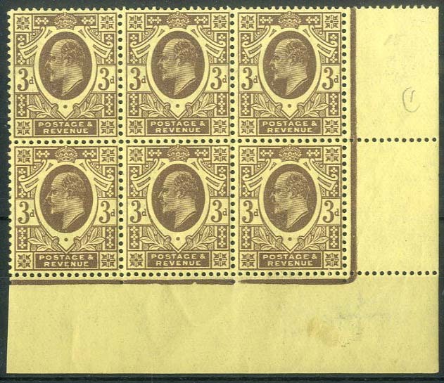 3d. purple on lemon, block of six (3x2) from the lower right corner of the sheet, original gum with five remaining unmounted mint; some gum creases or wrinkles, fine. Specialised M22 (1), £465