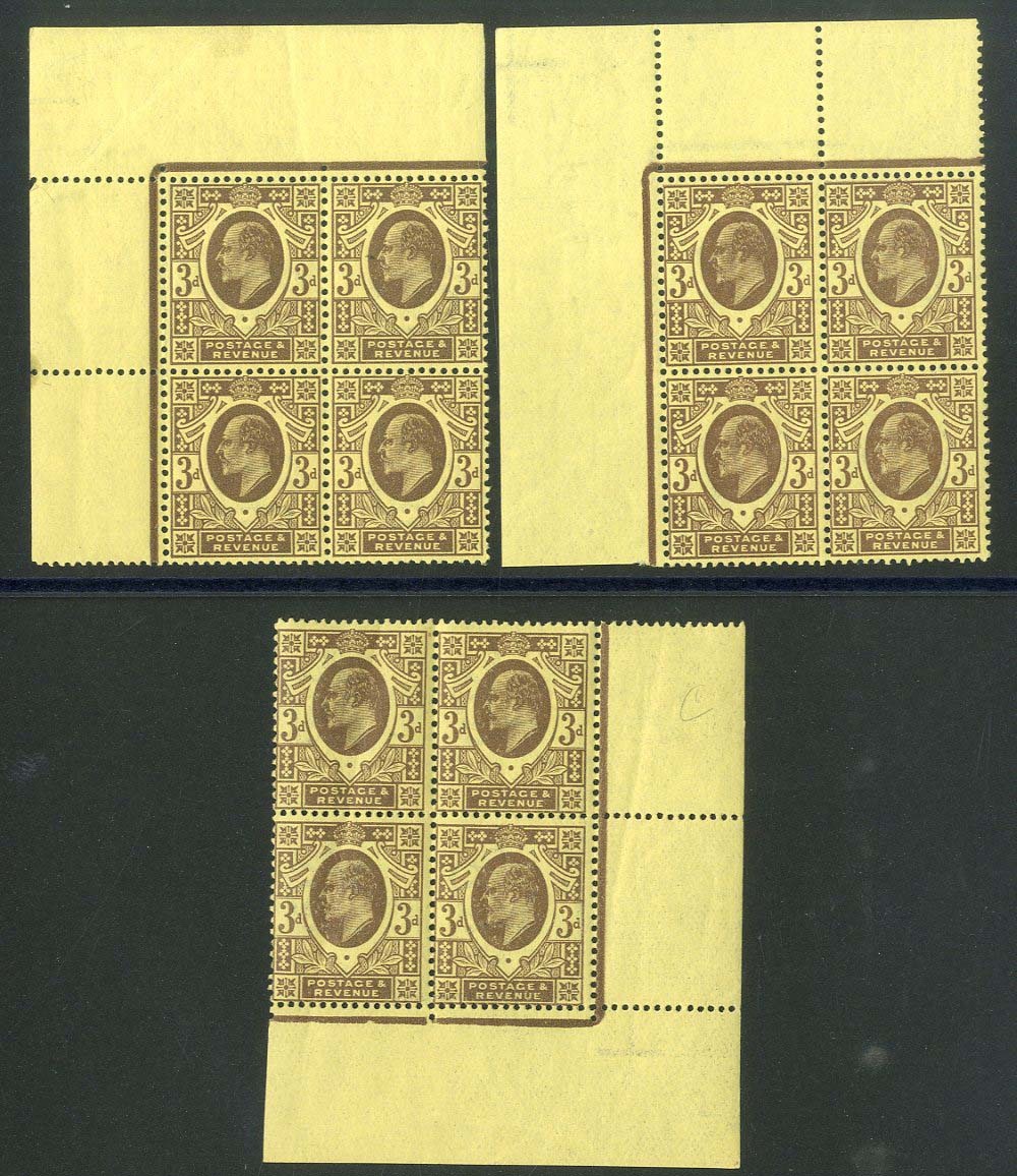 3d. purple on lemon, greyish purple on lemon and dull reddish purple on lemon shades, each in a corner block of four, unmounted mint (hinged in the margin); a few small wrinkles, fine and fresh. Specialised M22 (1, 2, 4), £1,050+