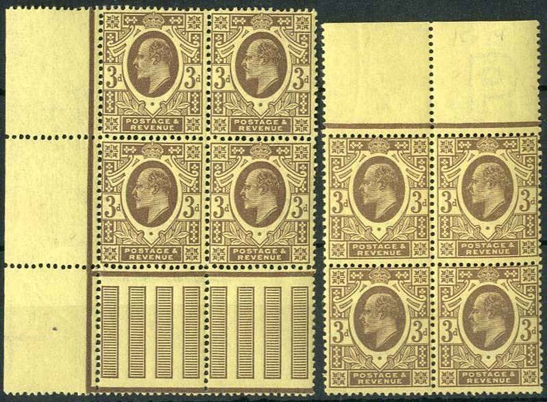 3d. purple on lemon and 3d. dull reddish purple on lemon shades, each in a block of four, unmounted mint except one stamp in the first block; fine. Specialised M22 (1, 4)