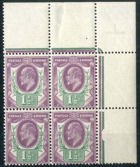 1½d. dull purple and green, block of four from the upper right corner of the sheet, unmounted mint; thin and pencil notation in the margin. Fine. Specialised M10 (5), £240+