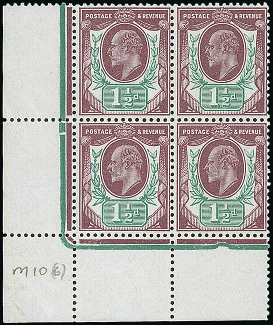 1½d. deep plum and deep green, block of four from the lower left corner of the sheet, unmounted mint (hinged in the margin); fine. Specialised M10 (6), £1,400. Photo