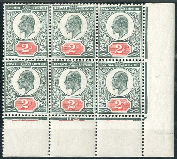 2d. deep dull green and red, block of six (3x2) from the lower right corner of the sheet showing date cuts under the fifth stamp, large part original gum with the lower row remaining unmounted mint; fine and fresh. Specialised M13 (1), £264+