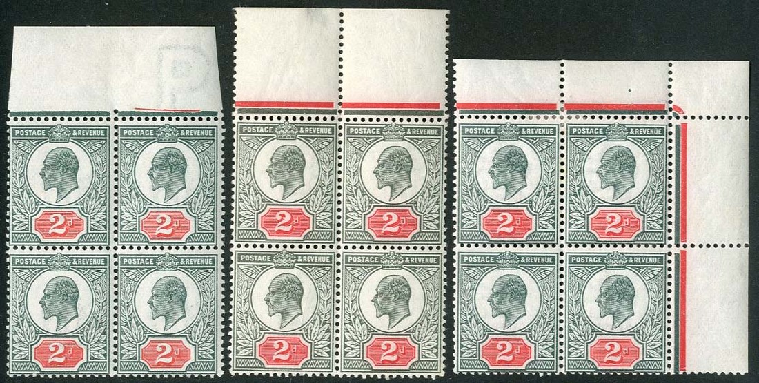 2d. deep dull green and red, 2d. deep dull green and carmine, 2d. deep dull green and carmine, all in blocks of four from the top of the sheets, the first with [R1/3] variety top right corner of value tablet damaged, the first two blocks unmounted mint, the third block with the lower row remaining unmounted mint. Fine. Specialised M13 (1, 2, 3), £1,370