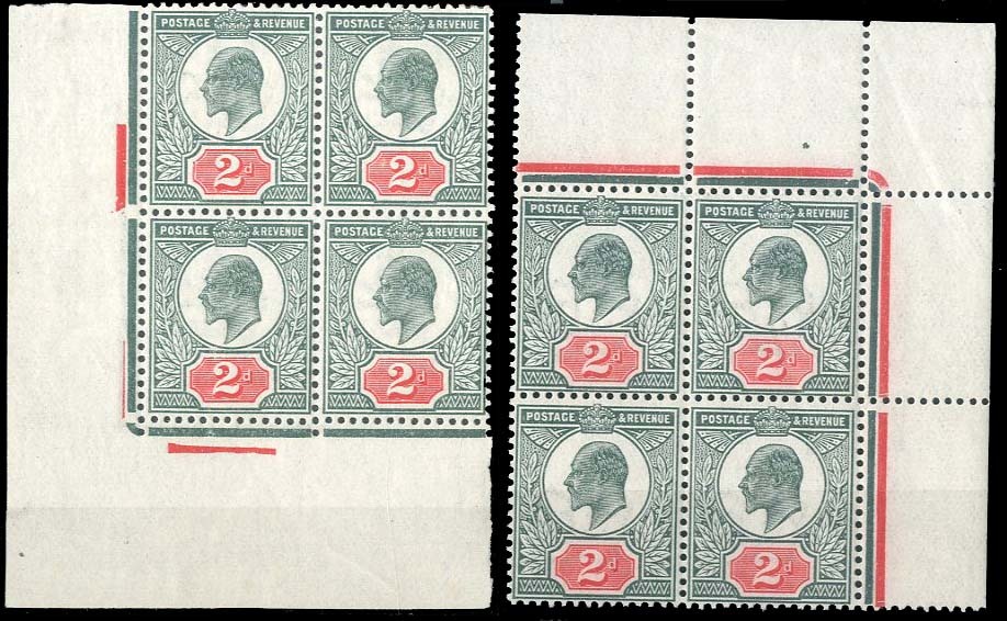 2d. deep dull green and carmine, 2d. grey-green and bright carmine, blocks of four from the corners of the sheets, unmounted mint except two in the first block, a few minor wrinkles, fine and fresh. Specialised M13 (2, 4), £398