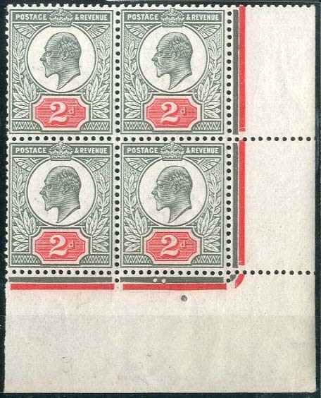 2d. grey-green and bright carmine, block of four from the lower right corner of the sheet, original gum with three remaining unmounted mint; fine and fresh. Specialised M13 (4)