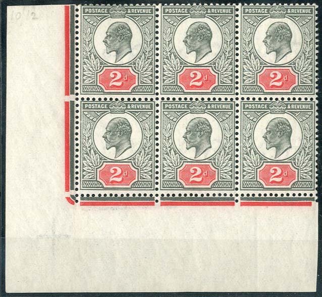 2d. grey-green and bright carmine, block of six (3x2) from the lower left corner of the sheet, unmounted mint; hinged in the margin, fine. Specialised M13 (4), £385+