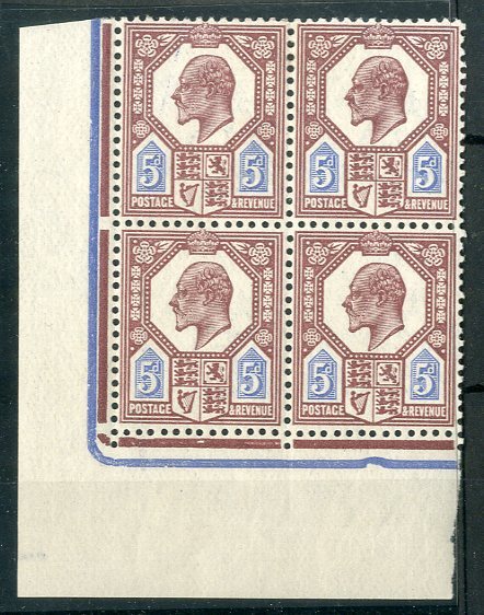 5d. dull reddish purple and cobalt blue, block of four from the lower left corner of the sheet, unmounted mint; fine and fresh. Specialised M30 (1), £275+