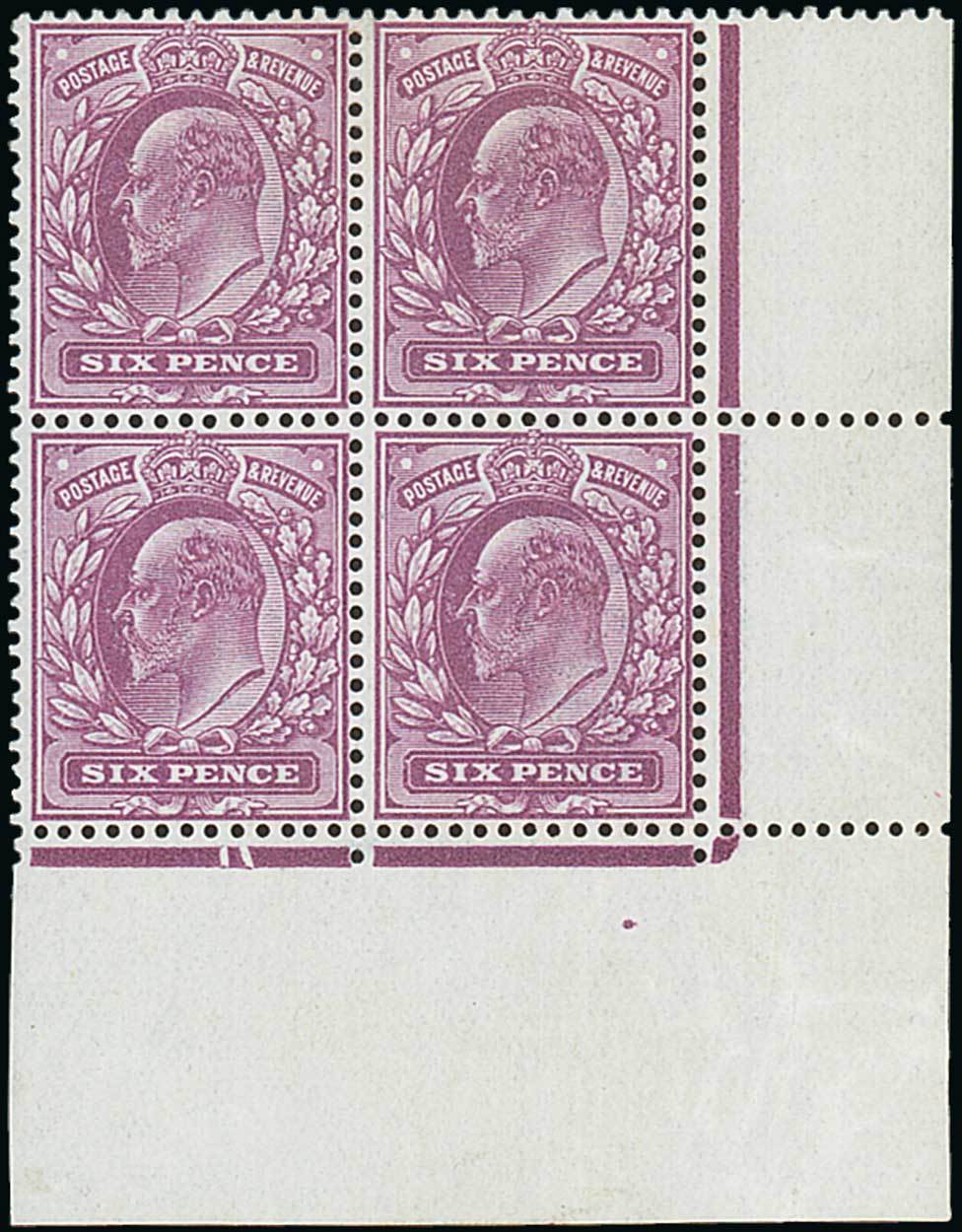 Flourescent ink 6d. Royal purple, block of four from the lower right corner of the sheet showing date cut below the third stamp, unmounted mint; very fine. Specialised M33 (1), £440+. Photo