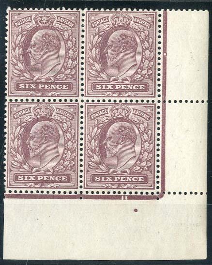 Non Flourescent ink 6d. pale dull purple, block of four from the lower right corner of the sheet showing date cuts and coloured dots below the fourth stamp, original gum with two remaining unmounted mint; minor gum wrinkles, fine. Specialised M33A (4), £180+