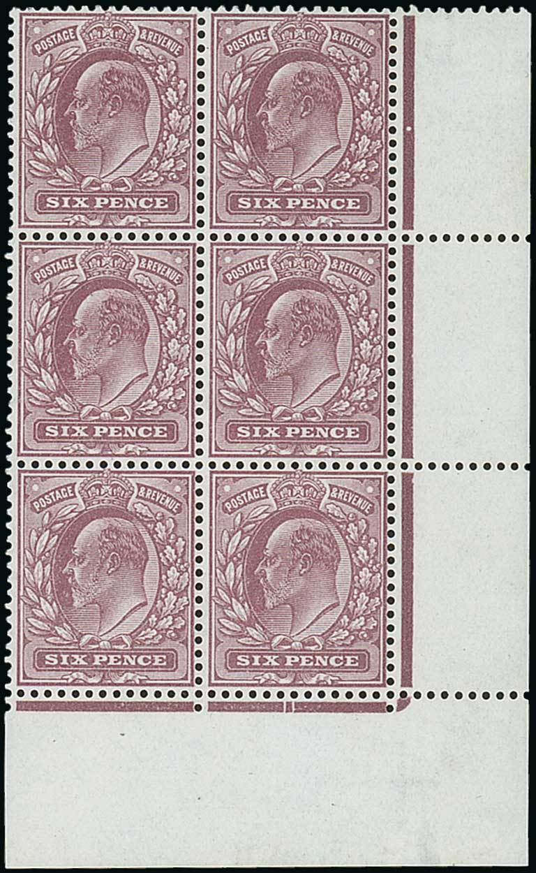 — 6d dull purple, block of six (2x3) from the lower right corner of the sheet showing date cuts below the last stamp, original gum with the lower block of four remaining unmounted mint, minor gum wrinkles and minor gum faults in the margin only at foot. Fine. A rare block. Specialised M34 (1), £2,750+. Photo