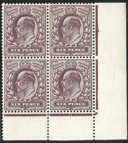 Chalk surfaced paper 6d. deep plum, block of four from the lower right corner of the sheet showing date cuts below the fourth stamp, unmounted mint; fine. Specialised M36 (2), £300
