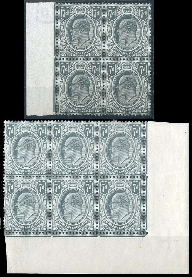 7d. slate-grey block of four from the left of the sheet, 7d. pale grey block of six (3x2) from the lower right corner of the sheet, original gum with several remaining unmounted mint, fine. M38 (2-3)