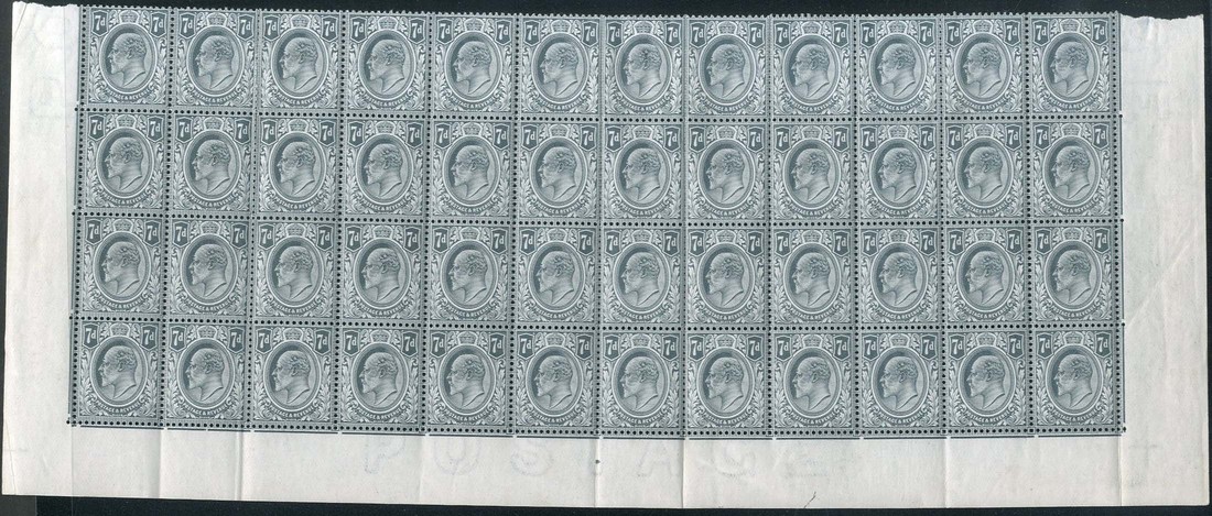7d. pale grey, block of forty-eight the lower four rows of the sheet, all but two unmounted mint; some gum wrinkles and creases, a few split and creased perfs., fine. A scarce block. Specialised M38 (3)