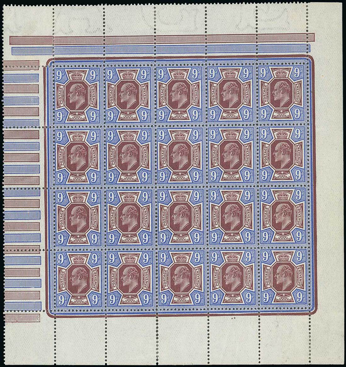 9d. deep dull reddish purple and deep bright blue, complete pane of twenty (5x4) showing date dots added under [R4/4], unmounted mint, fresh colours; some split perfs. and hinged in the margin, fine. Pieces showing the added dots are rare. Specialised M41 (2). Photo
