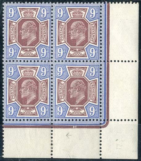 9d. dull reddish purple and blue, block of four from the lower right corner of the sheet showing date cuts below the fourth stamp, original gum with two remaining unmounted mint, fresh colours; light gum wrinkles, fine. Specialised M41 (3), £370++