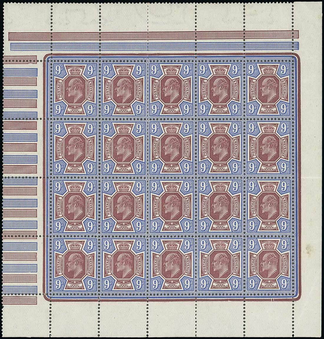 9d. deep dull reddish purple and blue, complete pane of twenty (5x4), unmounted mint, fresh colours; a few split perfs. and minor gum creases or wrinkles. Fine and rare. Specialised M41 (3), £2,500 as singles. Photo