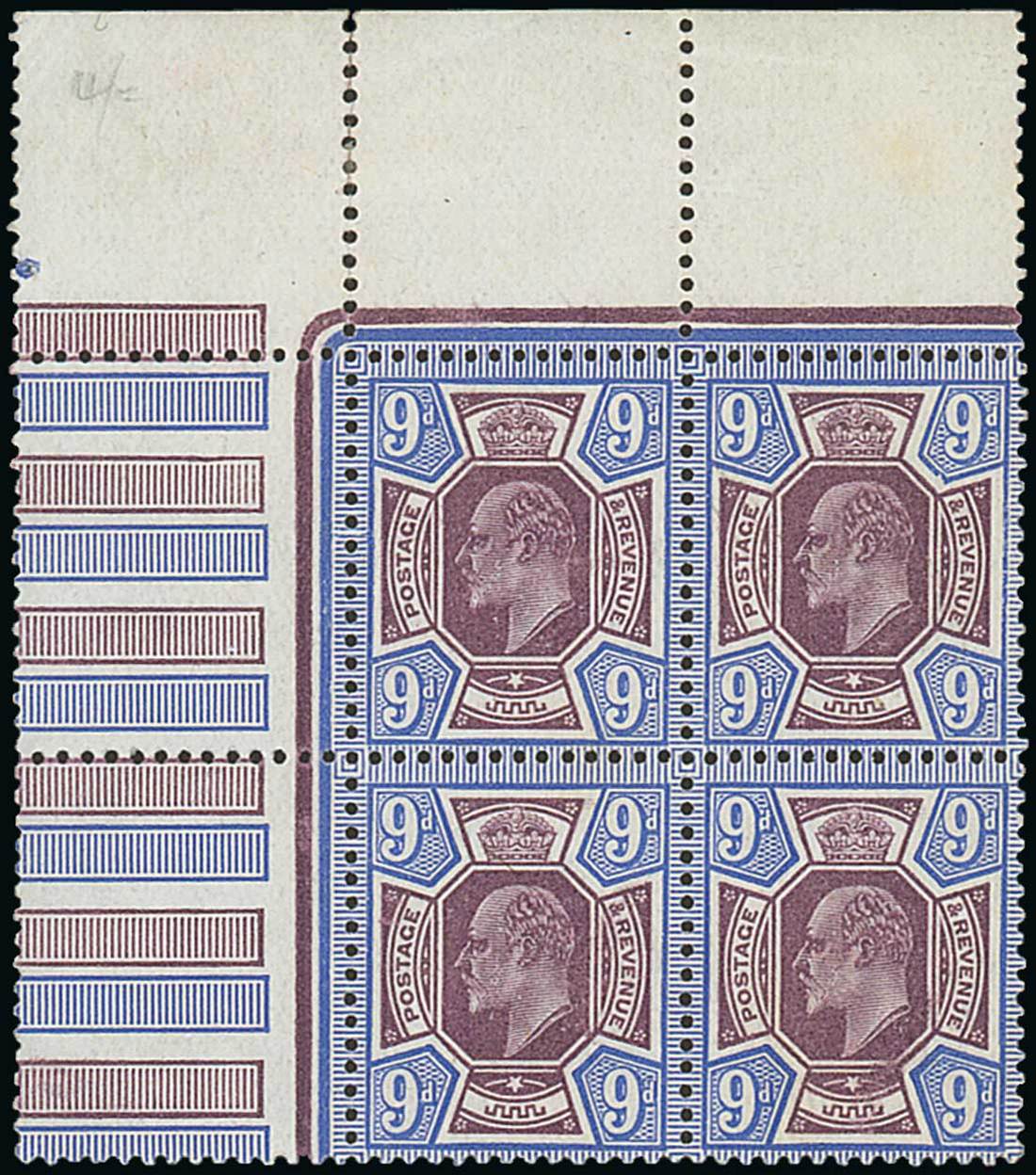 9d. slate purple and cobalt blue, block of four from the upper left corner of the sheet, unmounted mint, fresh colours; hinged in the margin, fine. Specialised M41 (4), £1,200++. Photo